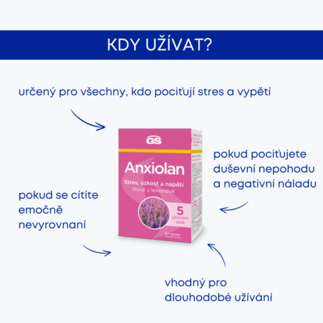 Doplněk stravyGS Anxiolan – nabízí účinnou pomoc při neklidu, úzkosti a napětí. Přípravek GS Anxiolan obsahuje unikátní kombinaci levandule a standardizovaných extraktů třezalky tečkované a kozlíku lékařského. Levandule dokáže nejen uklidnit, ale i zlepšit náladu! Kozlík lékařský napomáhá zklidnění a zvládání stresu. Třezalka tečkovaná podporuje psychickou pohodu a vyrovnanost. Navíc obsahuje hořčík a vitamin B6 – látky, které příznivě ovlivňují celý nervový systém. GS Anxiolan je šetrný k organismu.