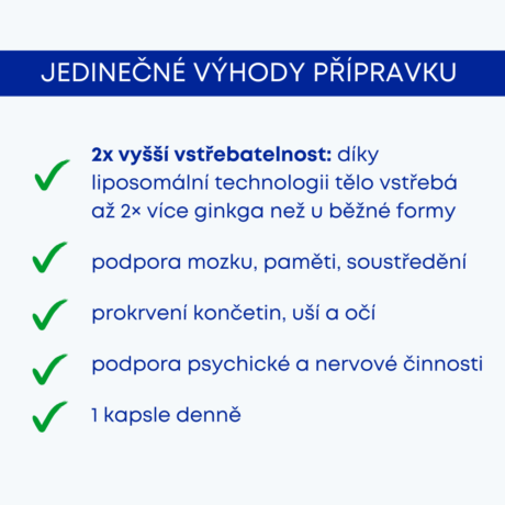 Díky liposomální technologii tělo vstřebá až 2× více ginkga než u běžné formy.