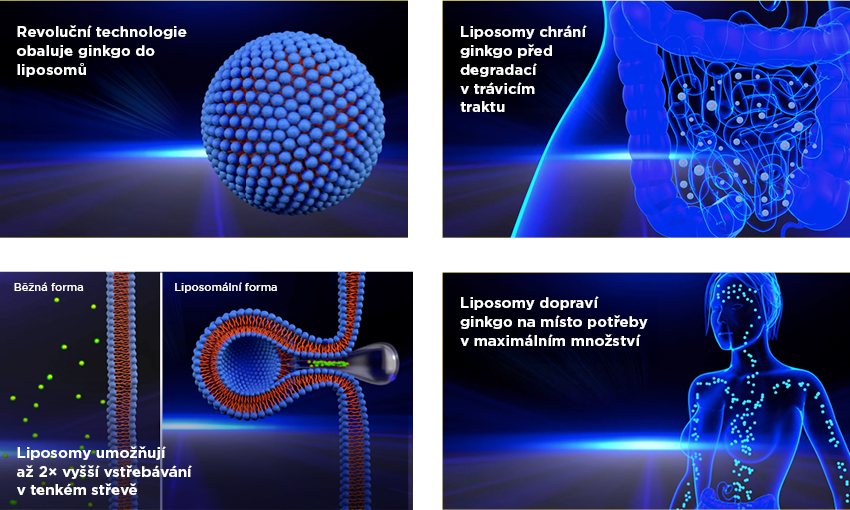 Mnoho látek, které přijímáme formou doplňků stravy, čeká při průchodu trávicím traktem strastiplná cesta, během níž se většina ztrácí. Liposomální forma tuto překážku překonává díky jedinečné technologii. Výsledkem je až 2× vyšší vstřebatelnost oproti běžnému standardizovanému extraktu ginkga.