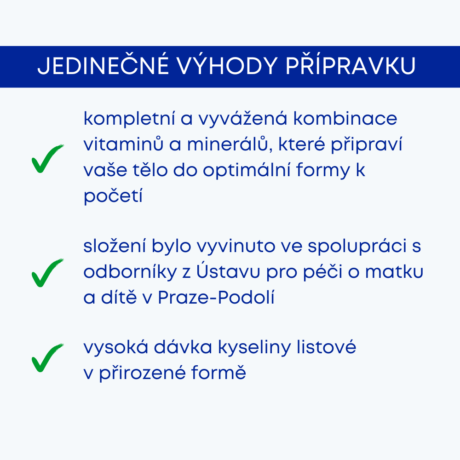 - Účinné složení vyvinuté specialisty na pomoc při otěhotnění z Ústavu pro péči o matku a dítě v Praze-Podolí pod vedením ředitele doc. MUDr. Feyereisla, CSc.